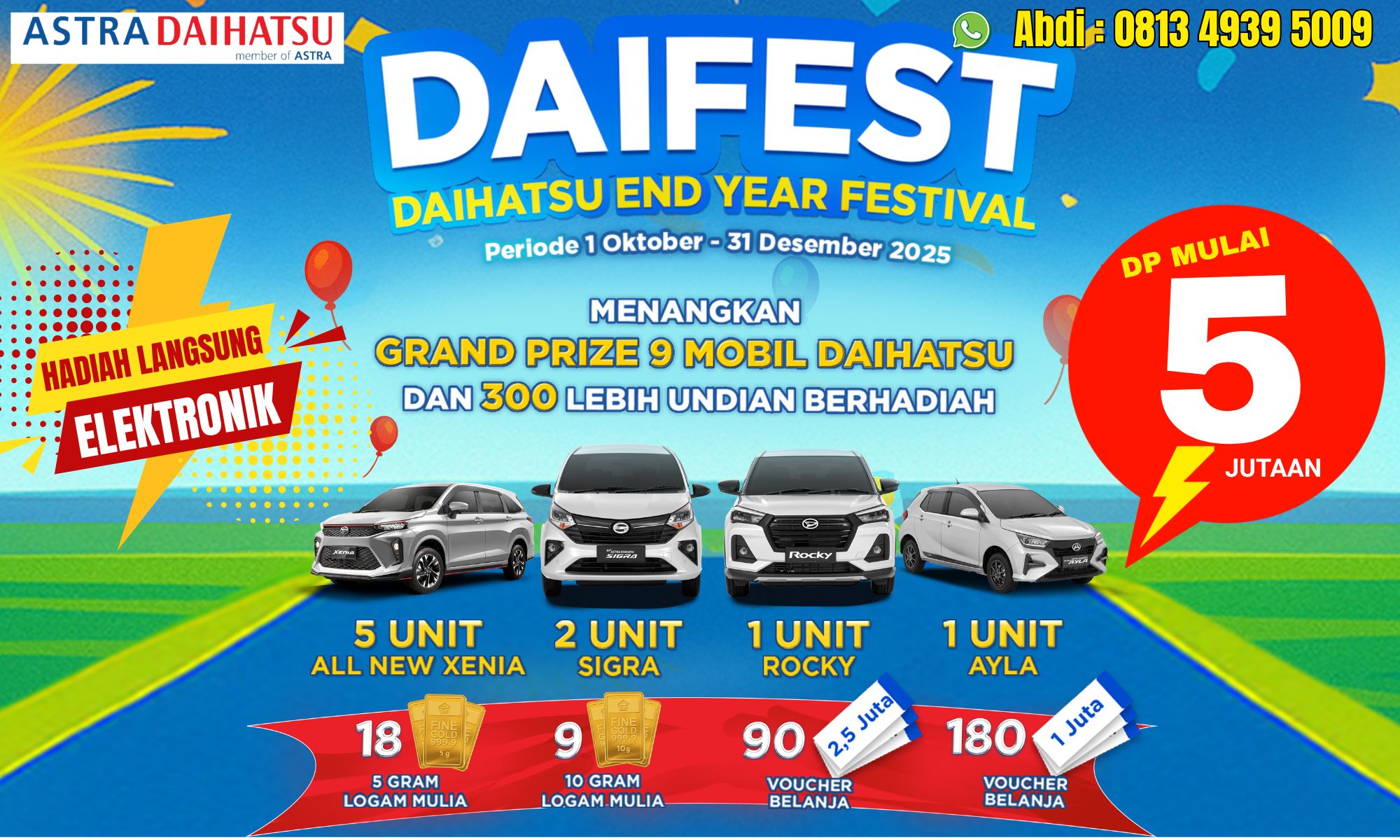 Khusus bulan ini, beli mobil Daihatsu apa pun di Astra Daihatsu dan dapatkan kesempatan memenangkan 9 unit mobil baru Daihatsu sebagai hadiah Grand Prize! πŸ†